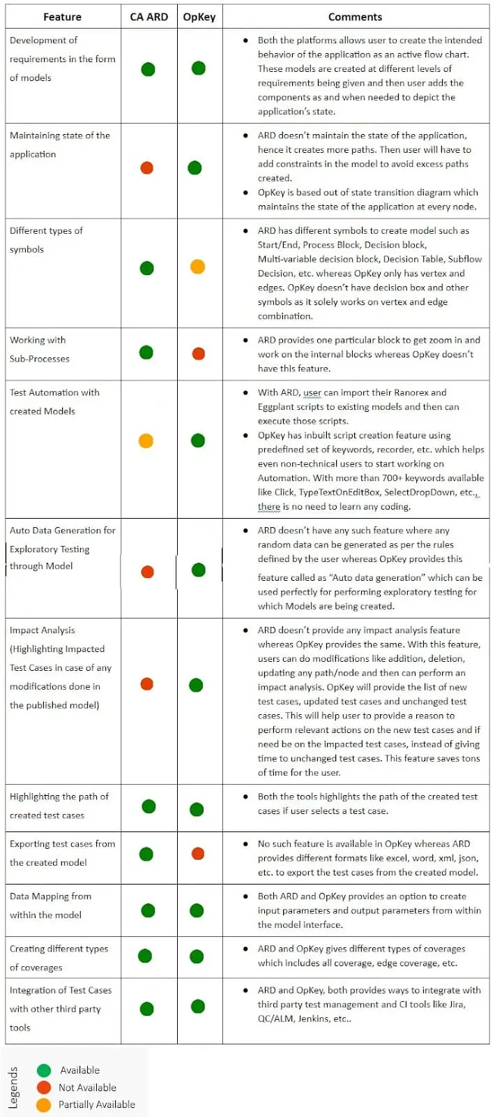 Model based testing of an application can be performed by using an MBT Tool like ARD of CA & OpKey. Let us compare the features of both tools, ARD of CA and OpKey.