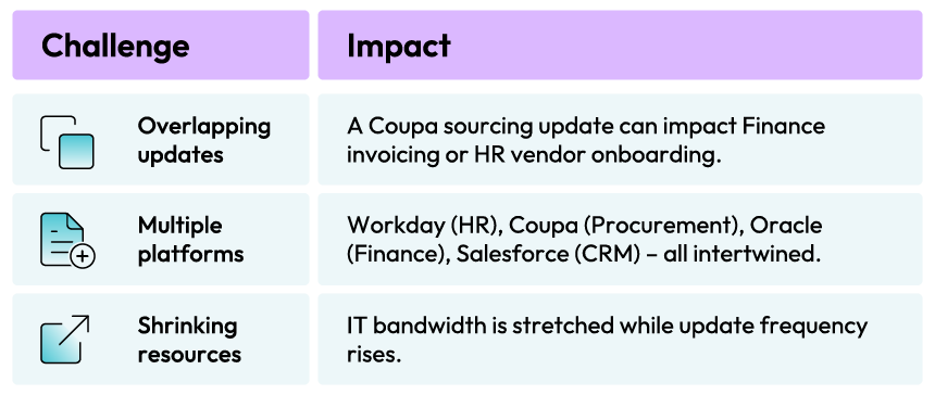 A missed dependency—like a Coupa sourcing change affecting Finance invoicing or HR vendor onboarding—can ripple into costly errors and compliance risks. In fact, 62% of IT leaders report update delays due to integration issues, and missed dependencies cause up to 40% of post-update failures
