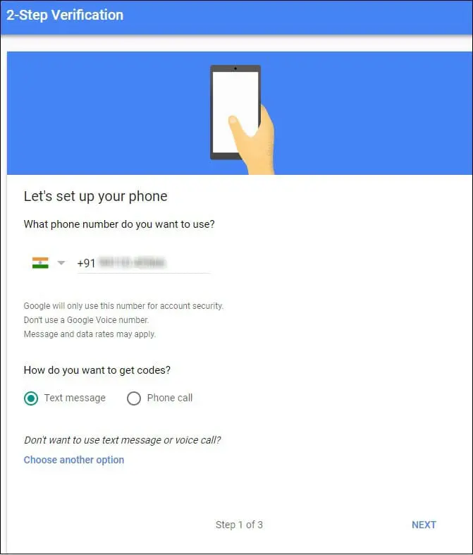 Select your country, enter your mobile number, choose radio button from Text message or Phone call & click on Next. (Here, we have chosen Text message option.)