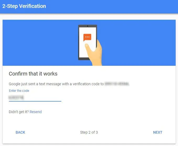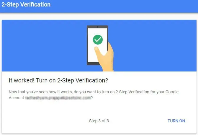 The entered code have been verified successfully & your Google account is ready for 2-step verification.