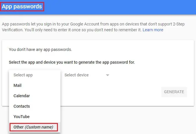 App Password window opens. Click on Select app & select Other (Custom name) option from the dropdown. When creating the app password simply choose “Other” and give it a name (example: my 2nd business email).