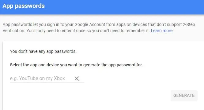 Next, you will need to generate an App password. You then use the app password in place of your personal Gmail password further.