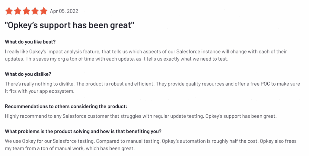 Opkey is proud to share that we continue to be recognized as a high performer in the Summer 2022 G2 Grid Report for Test Automation Software, with a near perfect average of 5 out of 5 stars.