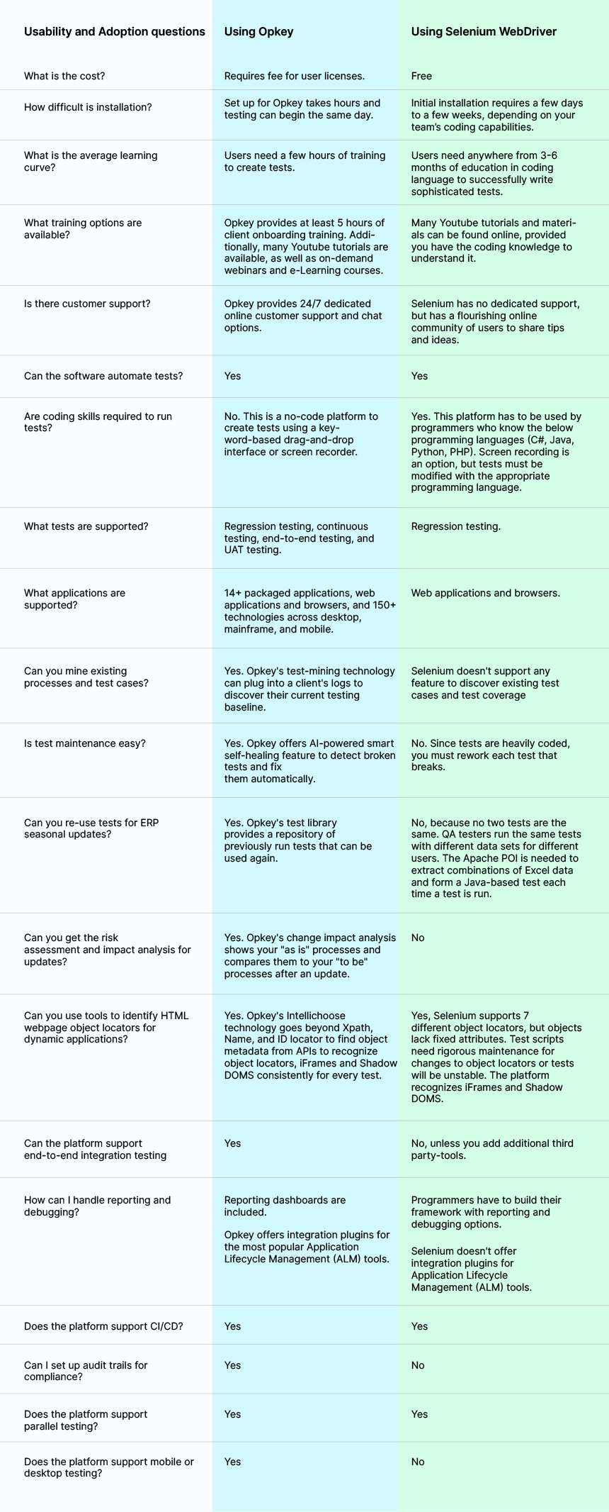 Opkey has pre-built accelerators for 12+ of the most popular enterprise applications. Selenium can accomplish these tasks, but with much more effort. We have customers calling weekly, complaining that “I don’t have time to build Selenium tests” and “I’m being yelled at for these tests taking us over timeline.” After using our product, those comments shift to “I finally have time to work on actual value-adding projects” and “updates aren’t so stressful anymore.”