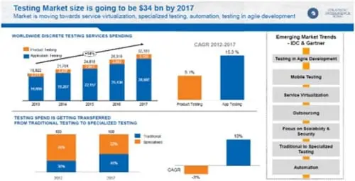 As per Gartner, the worldwide software testing market spending is going to be increased by 14%. The testing market size is going to be $34 bn in the year 2017, with emerging market trends of testing in agile development, mobile testing, automation etc.