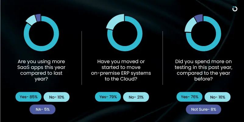 Our findings unveil a notable evolution in ERP usage. A striking 85% of participants now lean more heavily on SaaS applications than in the previous year. Meanwhile, 79% are shifting from on-premise systems to cloud-based alternatives, and an intriguing 78% are considering AI to enhance their testing strategies. These numbers clearly illustrate the rapidly changing face of ERP testing as we venture into the upcoming year.